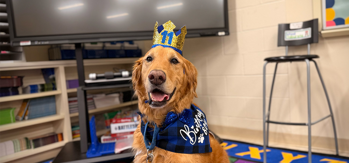 Ace, our comfort dog, turns 11 years old! Ace came to our school 3 years ago, and he has become a superstar — everyone loves him! Mrs Hart adopted him when he was 7 years old, and he is like a son to her. She dresses him in costumes for every party or special day at our school, and they come to every event that involves the O’Donnell family.